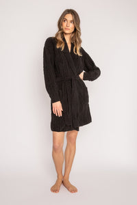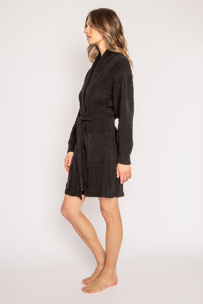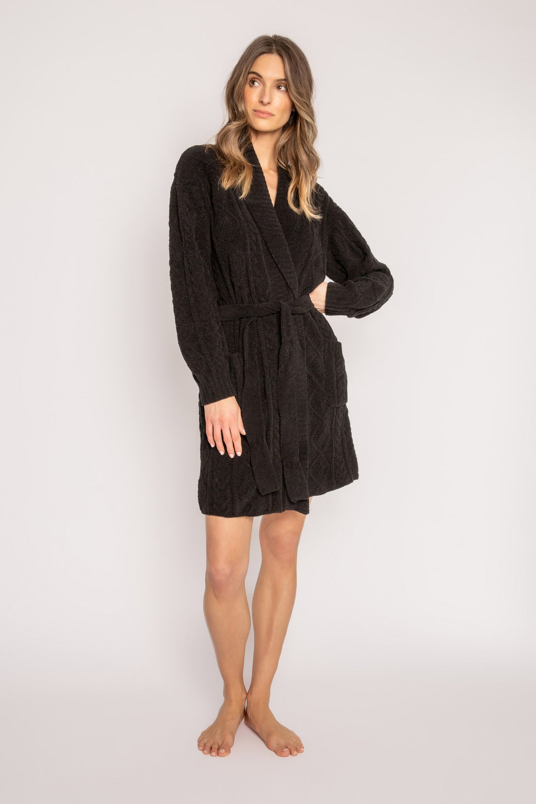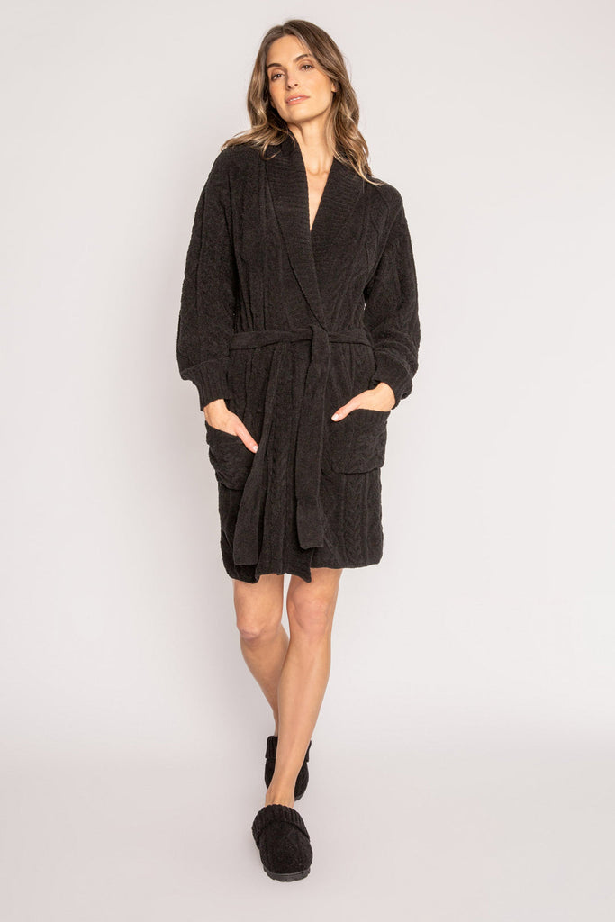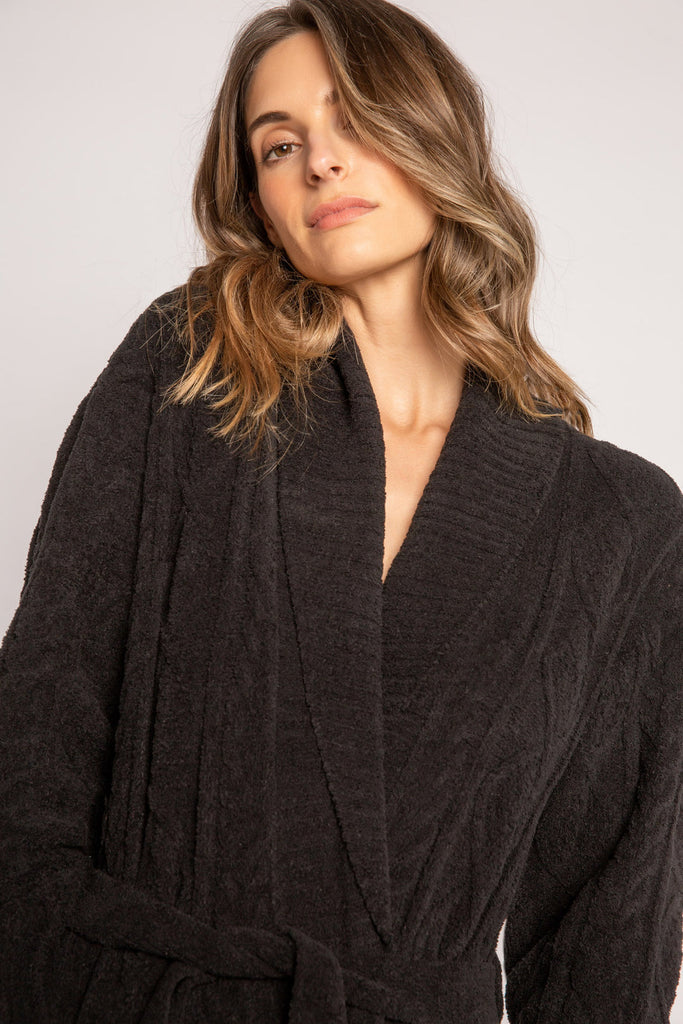 Possibly the yummiest texture robe you'll slip into this year. When the seasons change, you'll want this cable knit texture to look forward to. With a shawl collar, front pockets & tie-belt. Model is 5' 9", wearing size small.