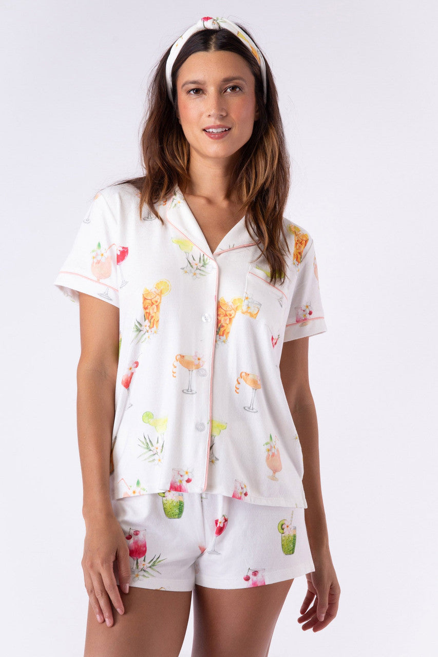 • A notched collar and short sleeves frame these jersey jammies with festive cocktails all over.