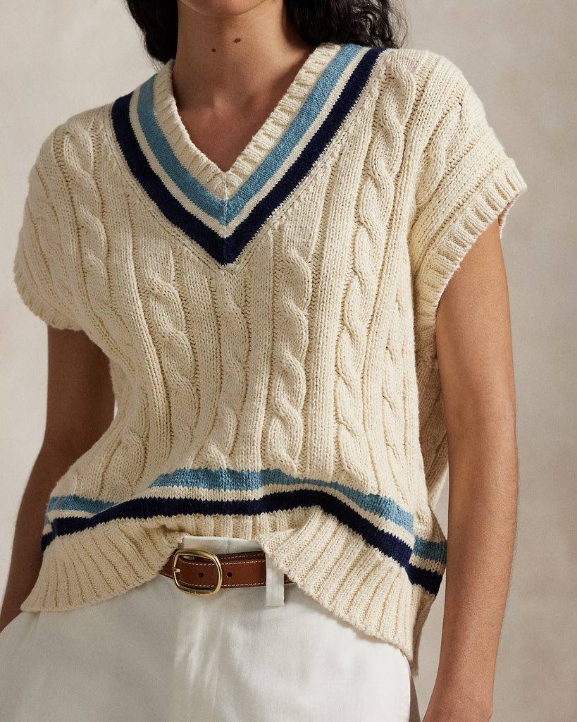 Modeled after Polo’s iconic cricket sweater, this vest is detailed with contrast striped trim at the collar and hem. Spun from thick-gauge cotton yarns, it’s enhanced with our signature cable-knit construction.