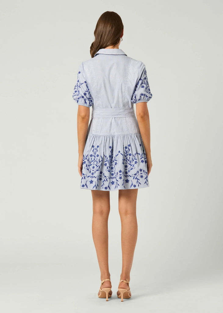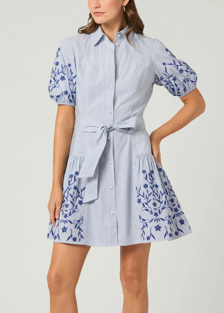 Cute embroidered pinstripe cotton mini shirtdress. This style features a shirt collar with a front button-down placket with white pearl buttons, short balloon sleeves with encased elastic at the openings, and a fitted bodice and waist with elastic smocking at the back and a separate waist tie belt. The skirt has flattering shirring at the side hips and side seam pockets. There is beautiful contrasting floral embroidery on the sleeves and on the sides of the skirt. Unlined. Buttonfront.
