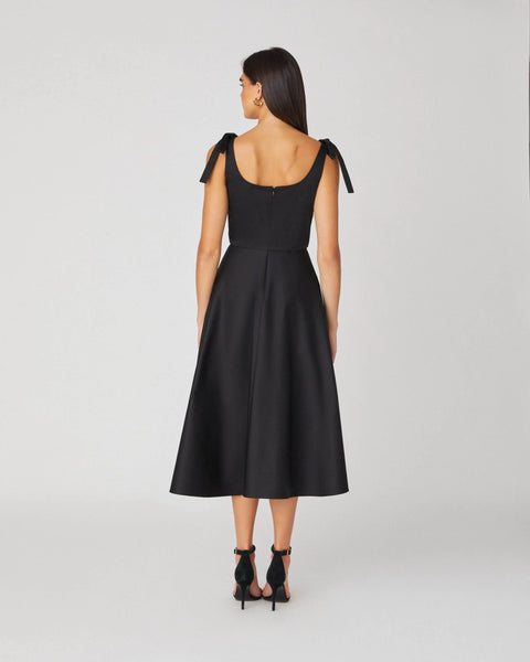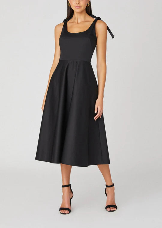 Beautiful, cotton sateen midi dress. This style features a scoop neckline with bow tie shoulder straps, a fitted bodice, and a full A-line midi-length skirt with side seam pockets. The bodice is lined and has interior boning for support. Skirt unlined. Hidden back zipper.