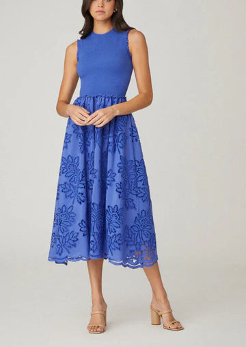 Pretty, eyelet crepe de chine sleeveless midi dress. This style features a round neckline, small ruffles at the armhole openings, a fitted elastic-smocked bodice, and a full A-line midi skirt. Bodice unlined. Skirt lined. Hidden back zipper.