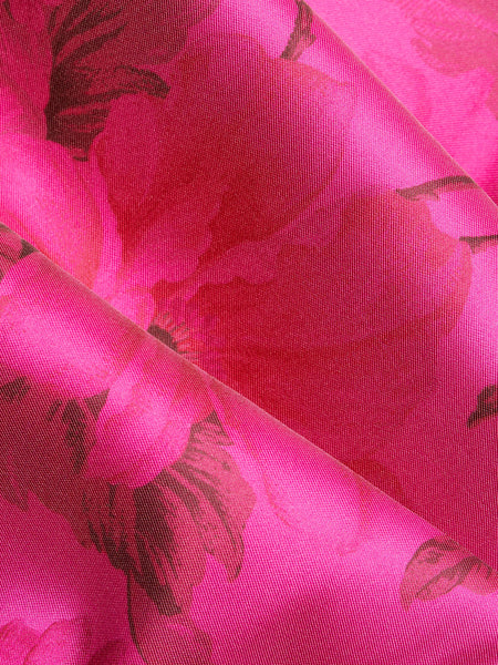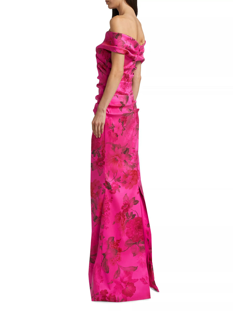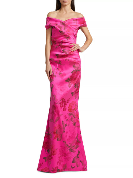 Teri Jon Stretch Printed Gazar Draped Off Shoulder- Pink Floral