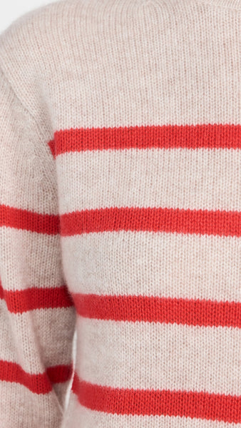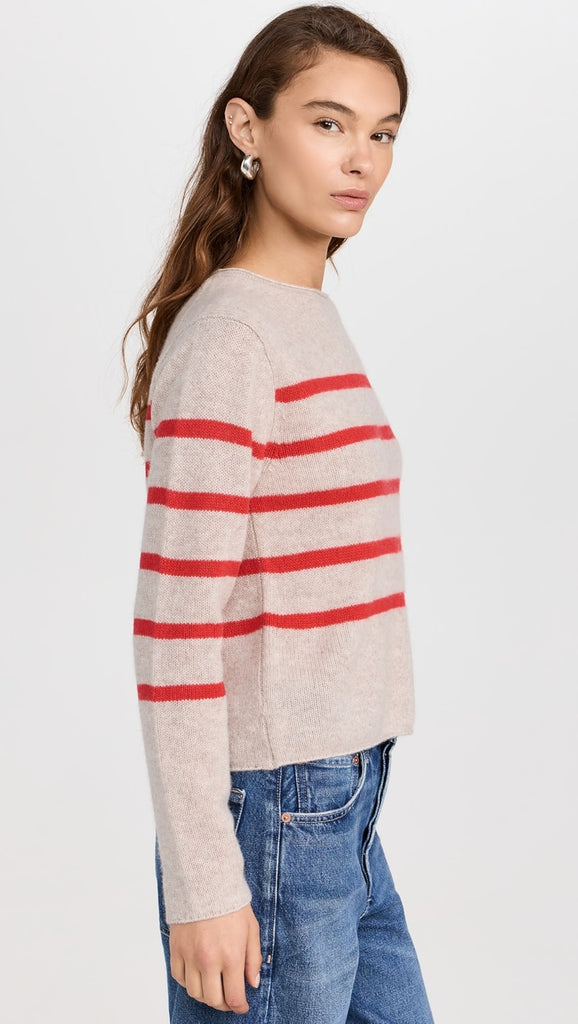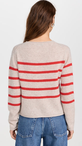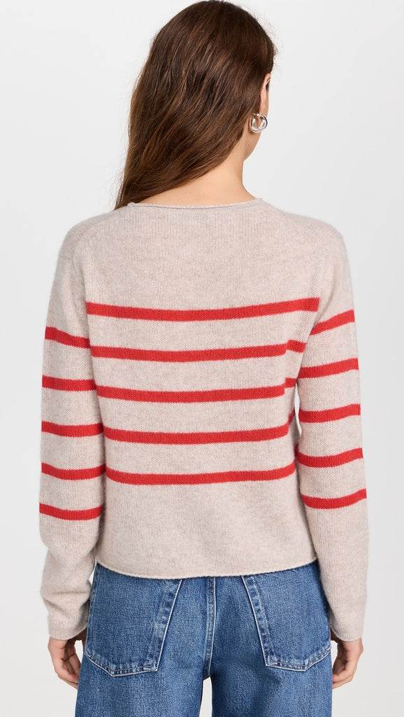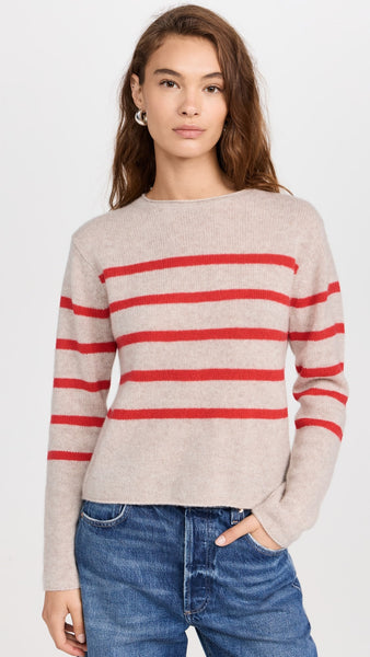 White+Warren Cashmere Striped Roll Trim Crew- Sandwisp/Scarlet